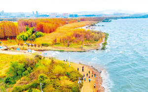 r江尾村湿地位于滇池绿谈呈贡区段的江尾村,占地1916.58亩。为切实加强环湖面源期凌防治重心使命,守好滇池生态保护底色,优化滇池驾驭生态环境,2018年,昆明市对江尾社区范围内滇池一级保护区的大棚及附属物进行了清算,并修建了一条长约1700米的湿地便谈,退耕还湖、整治卫生,坚毅不移鼓吹生态端淑诞生。
