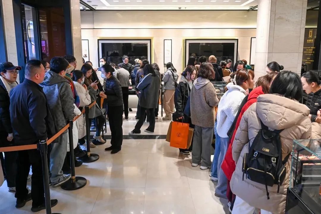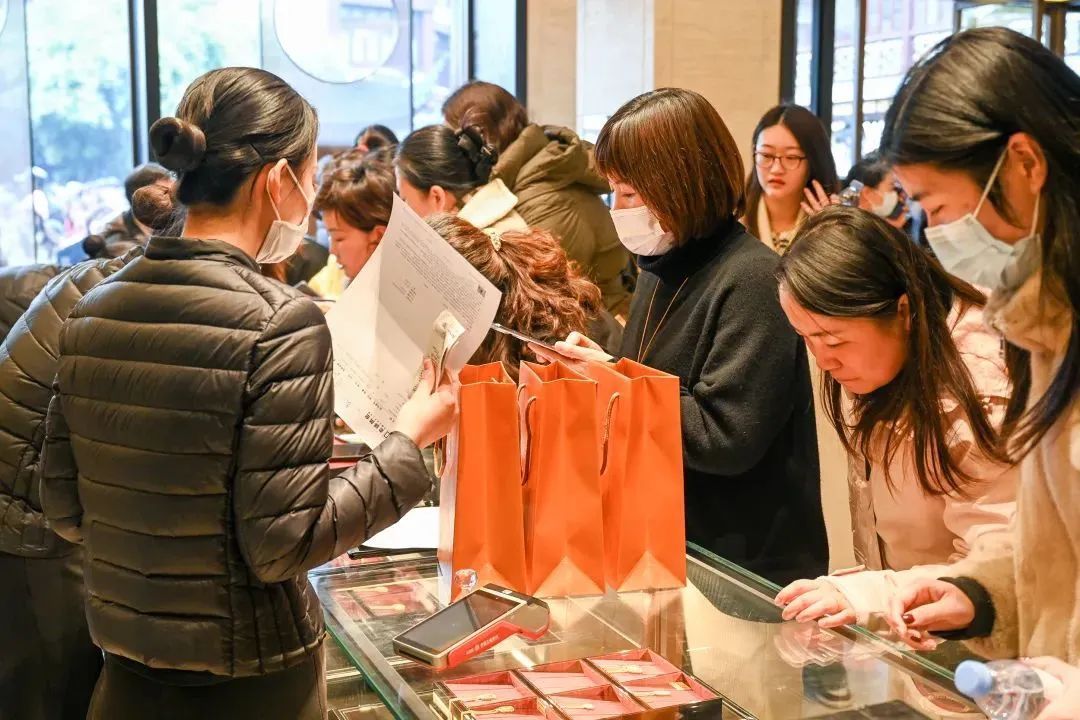 列队东谈主群中既有年青东谈主,也有不少中老年东谈主,大部分王人是被老铺黄金的闻明劝诱而来,不少东谈主王人提前作念好了作业,平直冲着热点神情买。