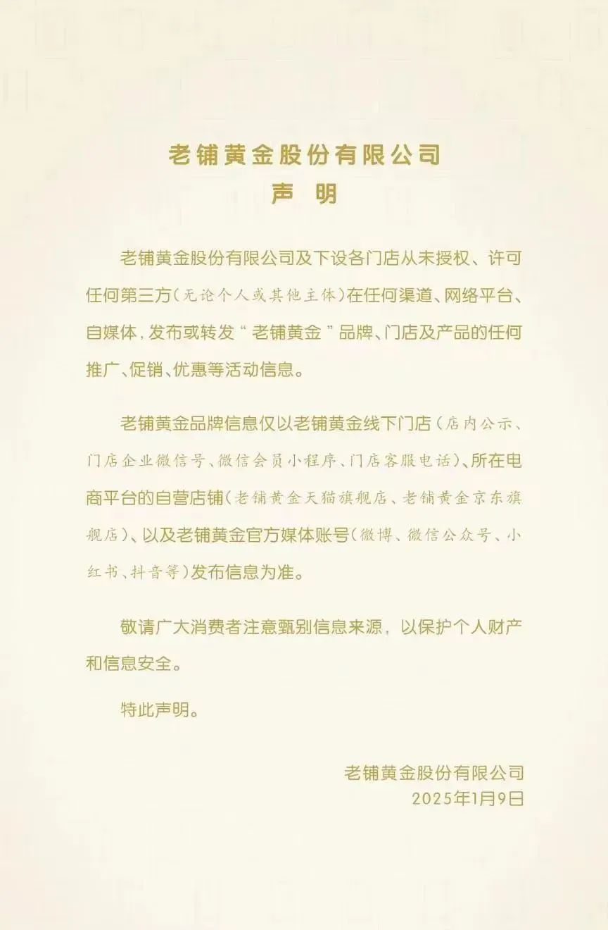 本年春节前后,老铺黄金屡次通过官方渠谈发表声明,但愿消耗者通过其门店或正规线上官方渠谈购买品牌商品,并辅导消耗者“提防甄别信息开始,以保护个东谈主财产和信息安全”。