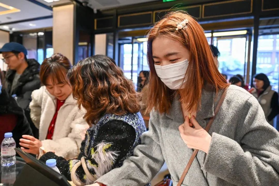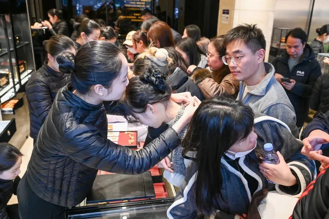 店内仅有中间、两侧共三排柜台,每个柜台也王人挤满了东谈主。“很昌盛,排了5个小时终于买到这款中意的项链。”施女士告诉记者,我方和家东谈主一大早开车从南通赶来。