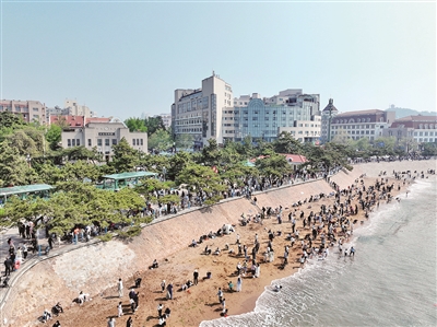 ■市民搭客在栈桥景区沙滩上嬉戏。王 雷 摄