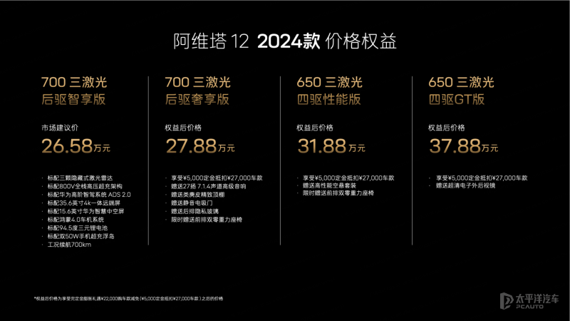 【太平洋汽车 新车频说念】近期阿维塔官方公布了2024款阿维塔12官方售价为26.58-40.08万元。手脚中期改款车型,新款阿维塔12新增晖金色车漆世博shibo登录入口,并在成立方面迎来了升级。值得一提的是,阿维塔12全系标配3激光雷达,搭载ADS 2.0高阶智能赞成系统和华为鸿蒙OS车机系统,能源上提供电动机后驱和双电机四驱可选,CLTC纯电续航最长700km。