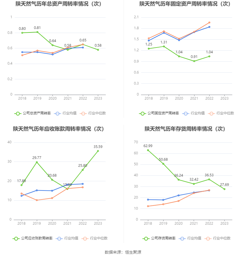 营运材干方面,2023年,公司公司总钞票盘活率为0.58次,上年同时为0.65次(2022年行业平均值为0.61次,公司位居同业业14/31);公司应收账款盘活率、存货盘活率离别为35.59次、27.69次。