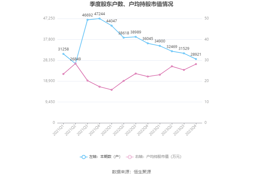 筹码齐集度方面,截止2023年年末,公司鼓励总户数为2.89万户,较三季度末着落了2608户,降幅8.27%;户均捏股市值由三季度末的25.40万元高潮至28.19万元,增幅为10.98%。