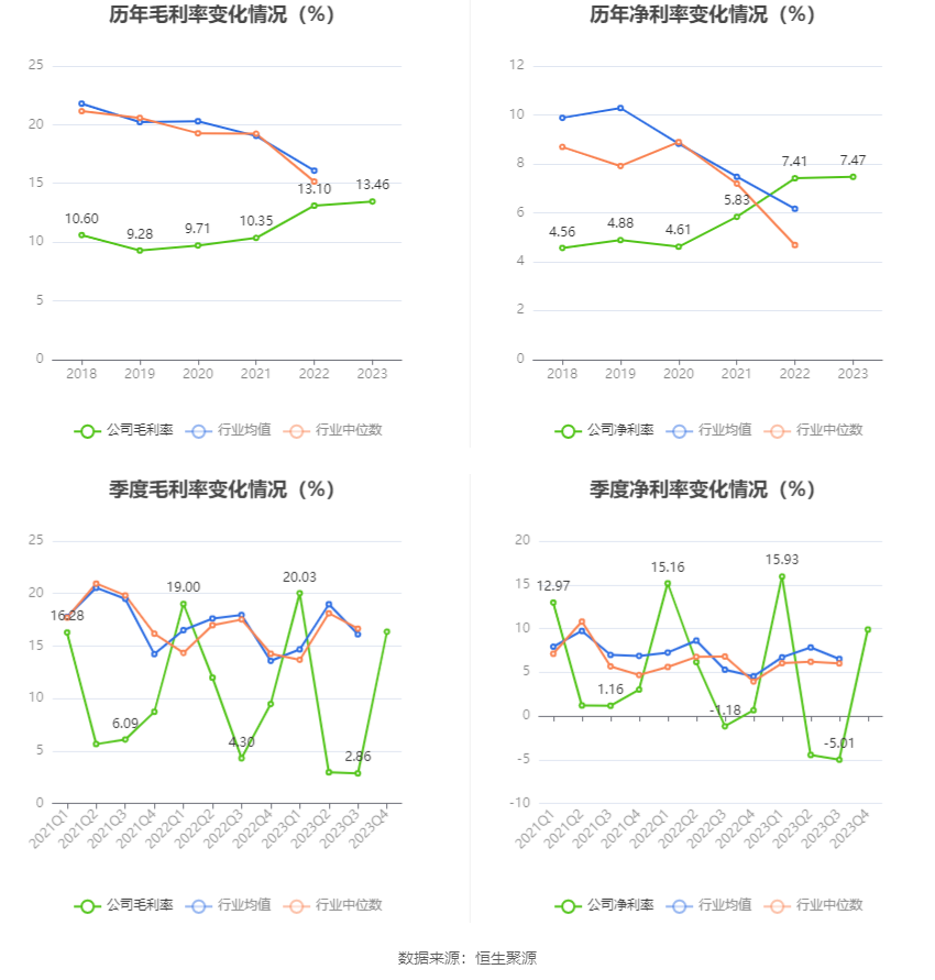 2023年,公司毛利率为13.46%,同比高潮0.36个百分点;净利率为7.47%,较上年同时高潮0.06个百分点。从单季度倡导来看,2023年第四季度公司毛利率为16.36%,同比高潮6.89个百分点,环比高潮13.50个百分点;净利率为9.88%,较上年同时高潮9.23个百分点,较上一季度高潮14.89个百分点。