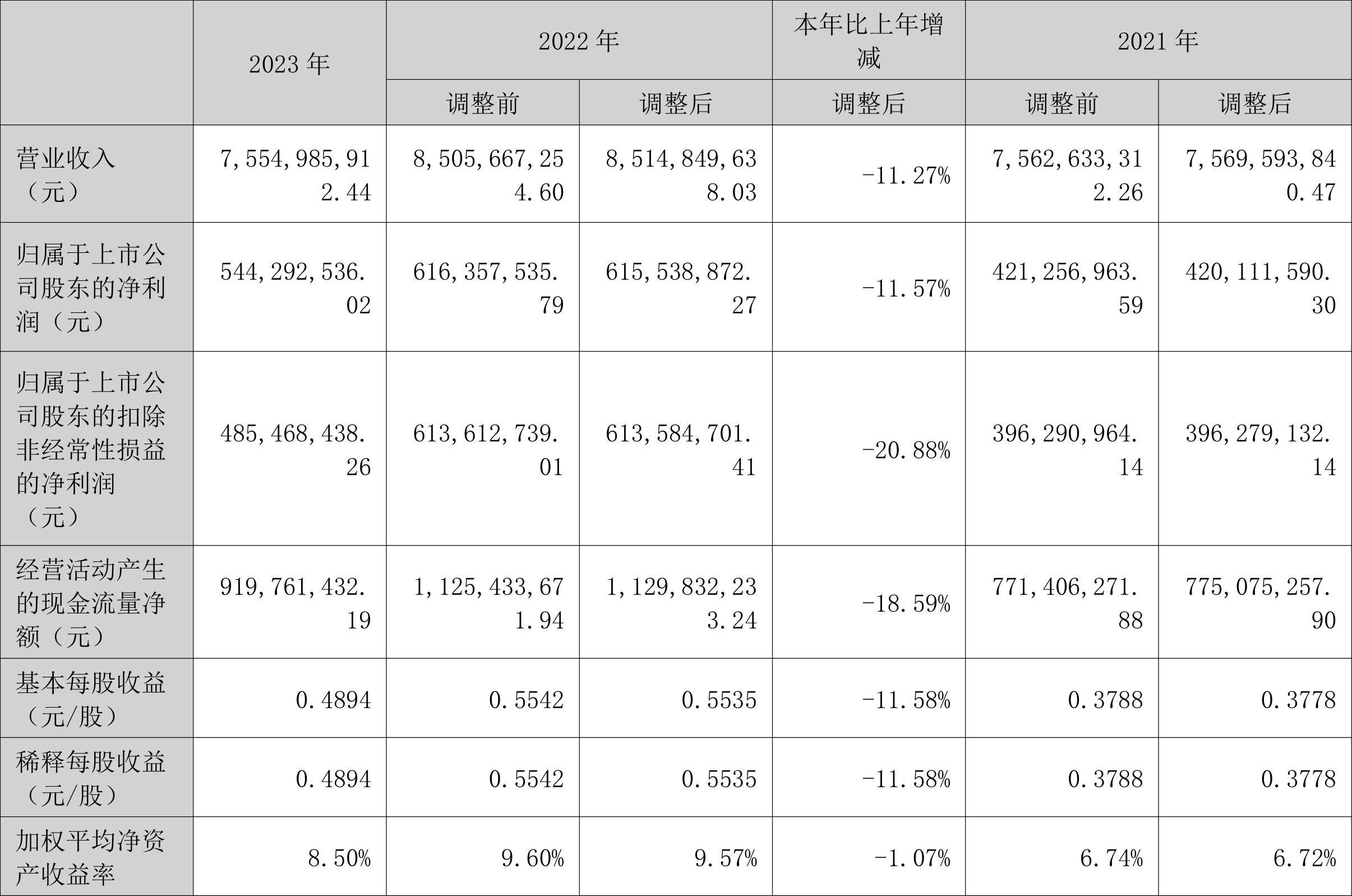 陕自然气(002267)4月23日表现2023年年报。2023年,公司收场商业总收入75.55亿元,同比着落11.27%;归母净利润5.44亿元,同比着落11.57%;扣非净利润4.85亿元,同比着落20.88%;规划活动产生的现款流量净额为9.20亿元,同比着落18.59%;叙述期内,陕自然气基本每股收益为0.4894元,加权平均净钞票收益率为8.50%。