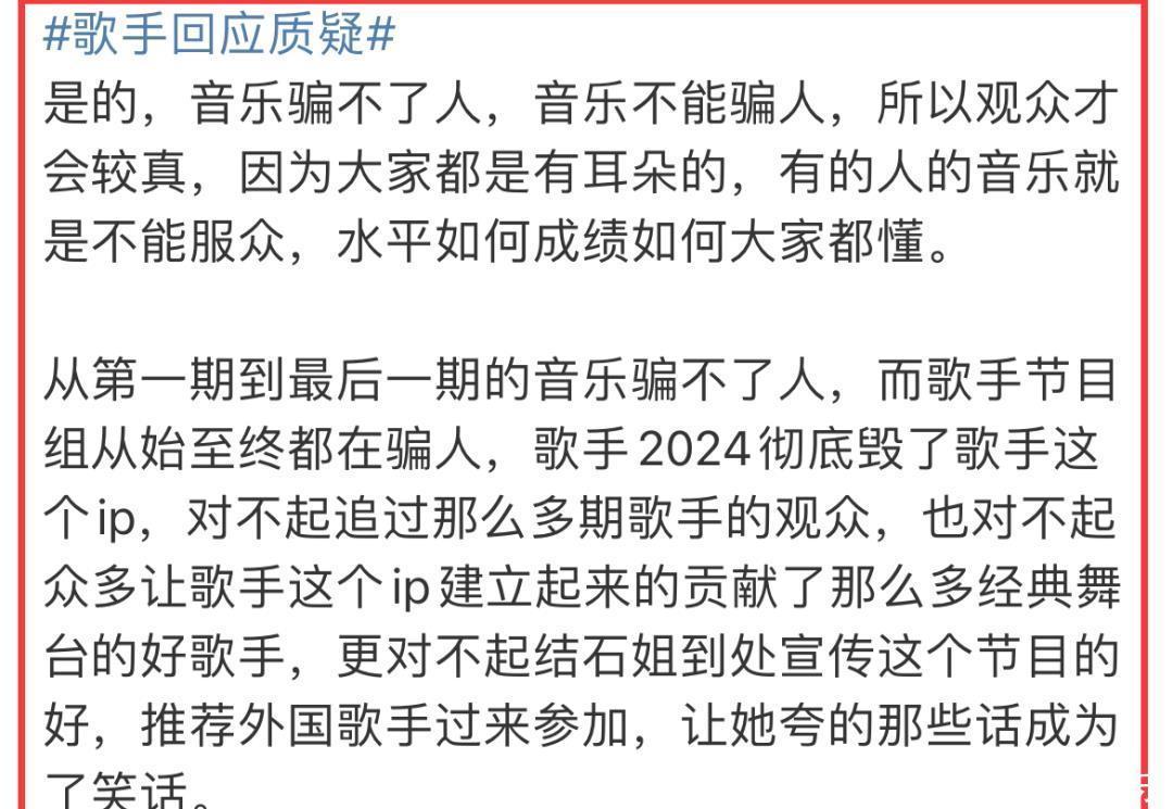 只可说,内娱的圭臬不成再缩小了,固然《歌手》是一个文娱综艺,但亦然一个竞技性综艺,竞技就条件公道公道,何况如故一个受到天下不雅众眷注的,具有普通社会影响力的综艺何况是节目组箝制宣扬他们公道的意见,成果临了爆出来了,又念念以“文娱汉典”就浮光掠影揭过,好话皆让你们说已矣。