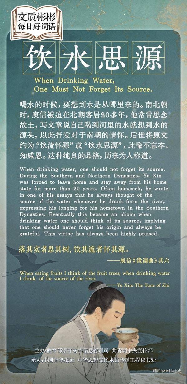 喝水的技艺,要猜想水是从那儿来的。南北朝时,庾信被动在北朝客居20多年,他同样念念念故乡,写著叙述我方喝到河里的水就猜想水的源流,以此表达对南朝的情感。后世将原文约为“饮流怀源”或“衣锦荣归”,比方不忘本、知感德。这种纯良的品格,历来为东说念主称说念。